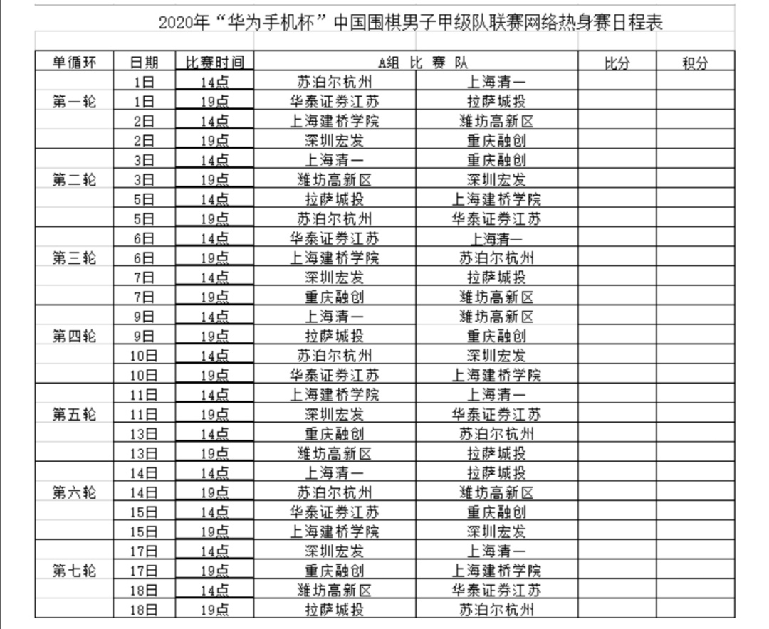 附:2020年“華為手機杯”中國圍棋男子甲級隊聯(lián)賽網(wǎng)絡(luò)熱身賽日程表