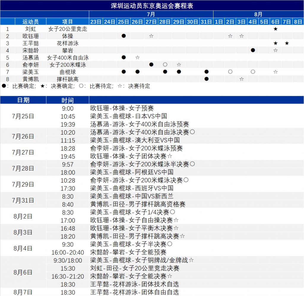 7月19日,深圳市文化廣電旅游體育局整理公布了深圳健兒在東京奧運會上的比賽日歷。