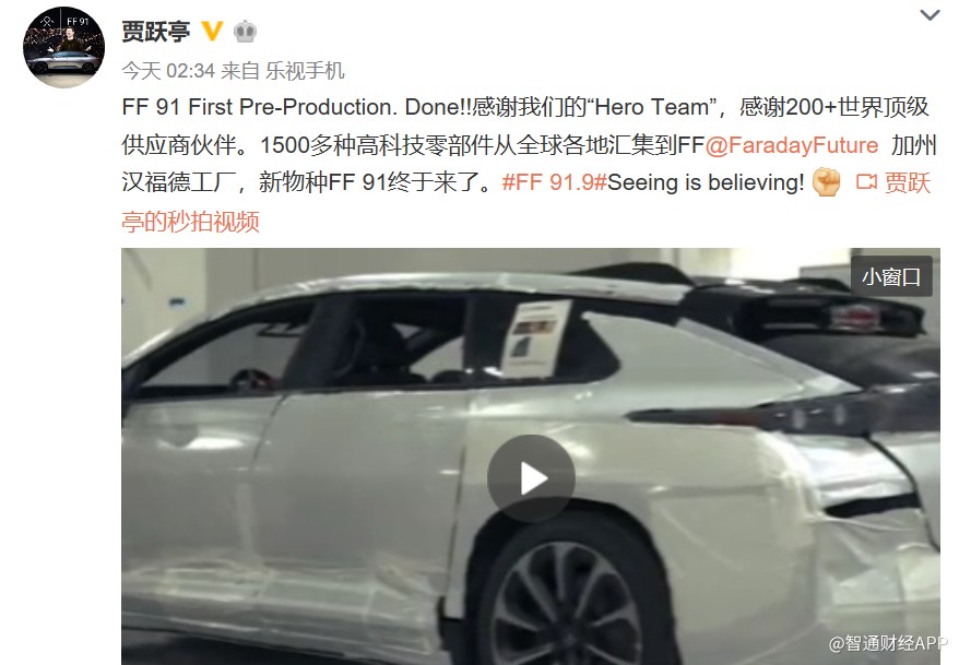 他在微博中寫道“感謝FF的‘Hero Team’,感謝200+世界頂級供應商伙伴,1500多種高科技零部件從全球各地匯集到FF加州漢福德工廠,新物種FF91終于來了?!?/p>