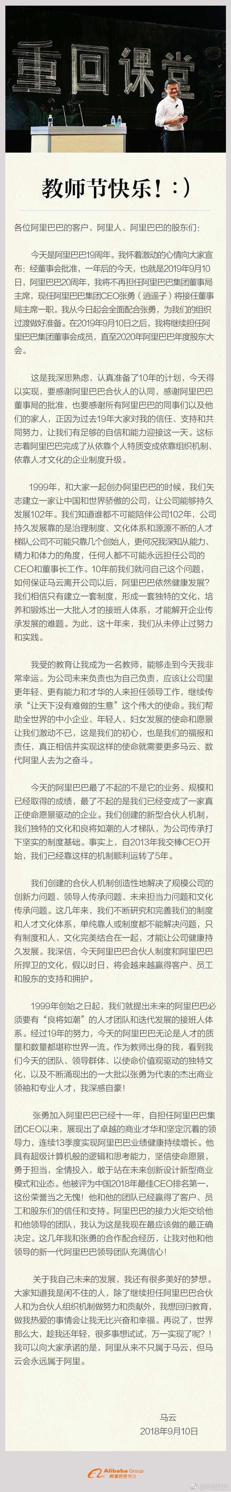 智通財(cái)經(jīng)APP獲悉,阿里巴巴官方微博和微信公眾號均發(fā)布了一封馬云的公開信,信中表示,一年后的阿里巴巴20周年之際,即2019年9月10日,他將不再擔(dān)任集團(tuán)董事局主席,屆時由現(xiàn)任集團(tuán)CEO張勇接任。