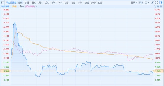 正式納入港股通的平安好醫(yī)生也明顯受到拖累。如果平安好醫(yī)生的分時(shí)圖和恒生指數(shù)的分時(shí)圖疊加,可以看出,平安好醫(yī)生早段有有迅速?zèng)_高的勢(shì)頭,但隨后受到大市的影響而轉(zhuǎn)跌,此后走勢(shì)與大盤幾乎同步。不過,平安好醫(yī)生走勢(shì)相對(duì)穩(wěn)健,最終僅跌1.15%,跑贏恒指,報(bào)價(jià)42.85港元,成交額1777萬港元。