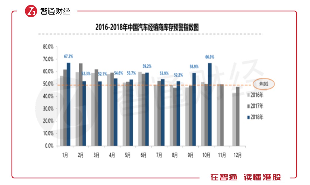 實際上,從汽車制造到最終消費者,流通過程要通過經(jīng)銷商,中汽協(xié)近日公布了經(jīng)銷商庫存預警指數(shù),顯示下半年以來,庫存預警指數(shù)均高于前兩年,10月份創(chuàng)出新高,預警指數(shù)達66.9%,而榮枯線為50%,汽車庫存堪憂,未來兩個月消化難度依然很大。