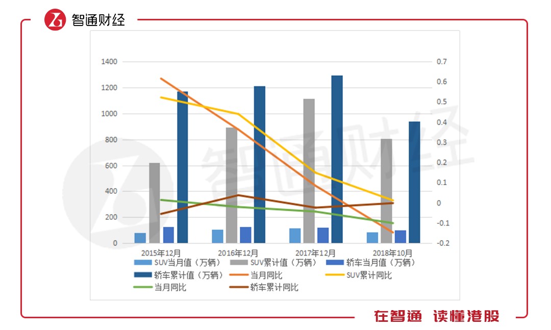 轎車和SUV車型在2018年首10月銷量合計約1749萬輛,分別占據(jù)了汽車以及乘用車76.5%和90.6%的份額,這兩類車型的消費表現(xiàn)代表了整個汽車以及乘用車行業(yè)的景氣情況。
