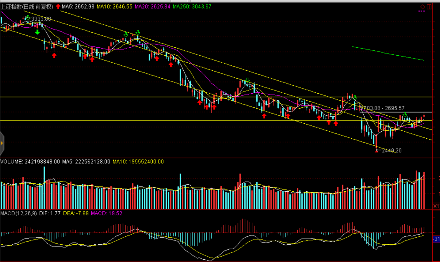 技術面:上周周線量價配合震蕩上揚趨勢,自10月19日見底以來運行21個交易日,短期指數仍有反復上揚需求,本周20周均線面臨壓力(滬綜指2700點一線、創(chuàng)業(yè)板1430點一線)。