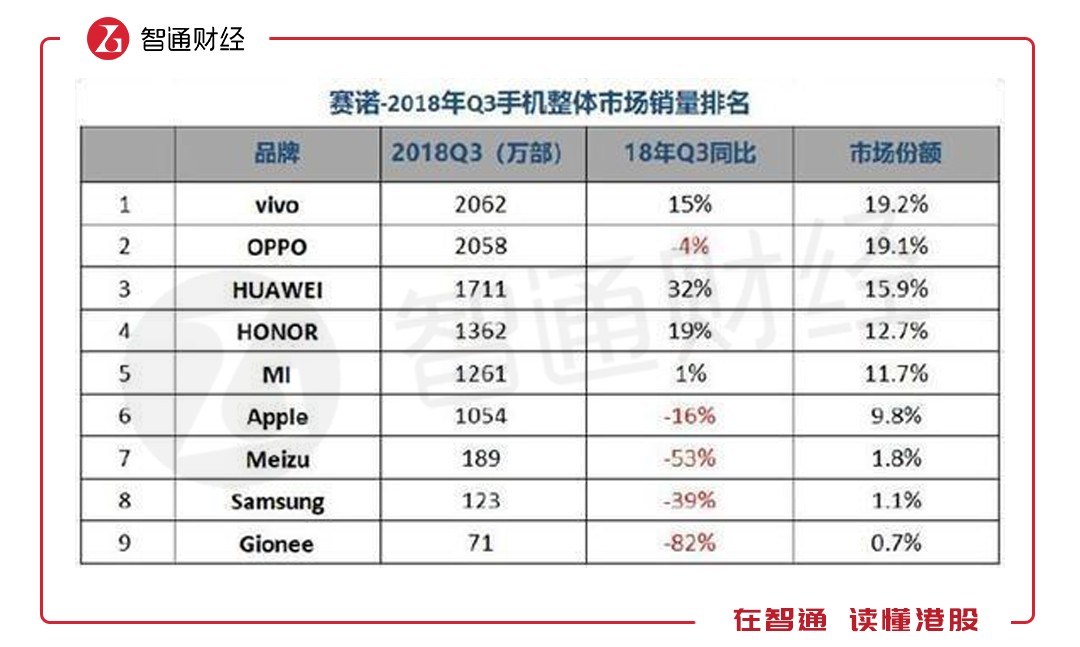 在2008年,全球前六大手機(jī)廠商,諾基亞、三星、摩托羅拉、LG、索尼愛立信和中興(00763),其中只有中興為自主品牌,但市場(chǎng)份額不足5%。再看看2018年這十年的變化,全球前六大手機(jī)廠商,三星、華為、蘋果、小米(01810)、OPPO和Vivo,其中自主品牌占了四個(gè),市場(chǎng)份額合計(jì)占比達(dá)40%。