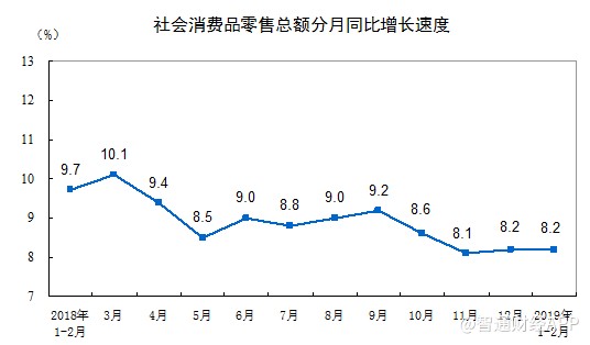 智通財經(jīng)APP獲悉,國家統(tǒng)計(jì)局公布,2019年1-2月份,社會消費(fèi)品零售總額66064億元,同比名義增長8.2%,符合預(yù)期,但低于前值增長9%。其中,限額以上單位消費(fèi)品零售額23096億元,增長3.5%。