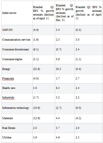 截至上周三下午,標(biāo)準(zhǔn)普爾500指數(shù)成份股的505家企業(yè)中有25家公布了業(yè)績(jī),綜合增長(zhǎng)預(yù)期為-4.6%,11個(gè)行業(yè)中有8個(gè)預(yù)計(jì)每股收益將同比下降。這大大低于截至12月31日預(yù)計(jì)的增幅(3.0%)。