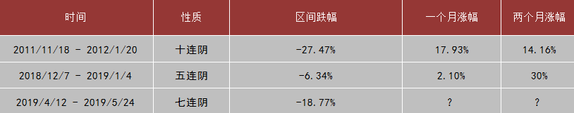 上周市場周一探底后,在稀土、芯片、華為概念等貿(mào)易戰(zhàn)板塊個股帶領下上破2900點,最終由于量能不濟,震蕩回落。最終,上證指數(shù)報收2852.99點,周跌幅-1.02%;深證綜指報收1496.03點,跌-2.43%;創(chuàng)業(yè)板指收1443.75點,跌-2.37%。值得一提的是,創(chuàng)業(yè)板指數(shù)周k線七連陰,統(tǒng)計表明,創(chuàng)業(yè)板歷史上,周k線出現(xiàn)五連陰及以上的情況僅有兩次,無一例外的對應了階段性底部區(qū)域。對應后續(xù)一個月及兩個月的漲幅如下表所示: