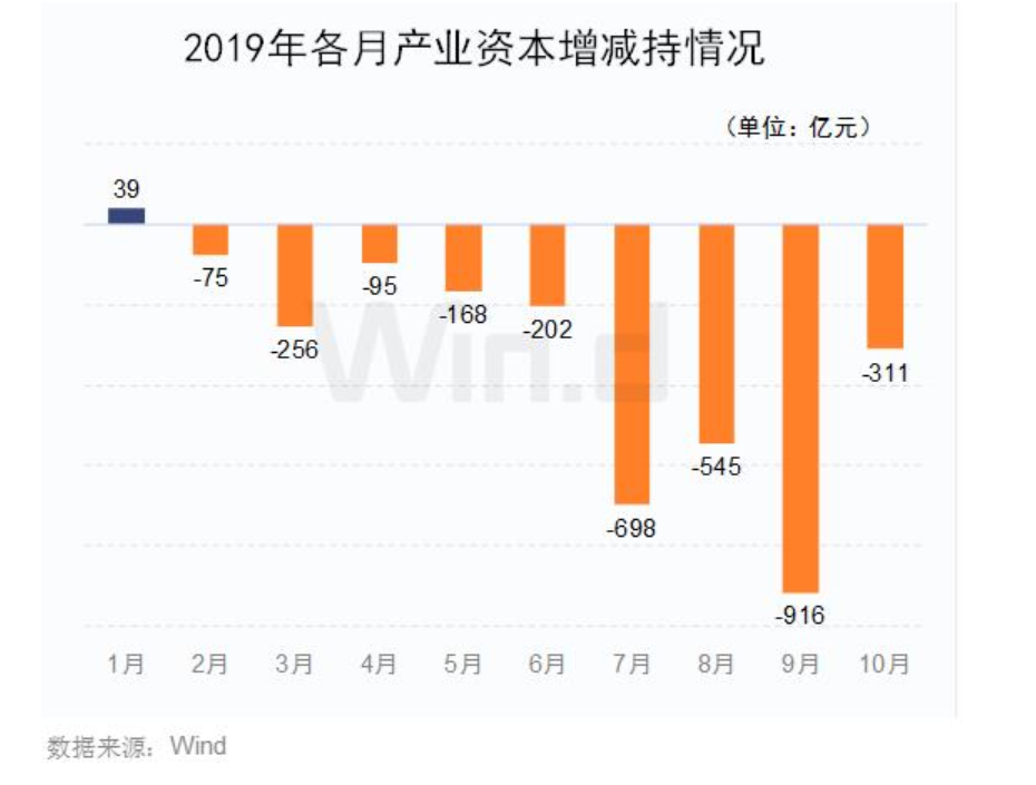 3、產(chǎn)業(yè)資本減持:Wind數(shù)據(jù)統(tǒng)計(jì)顯示,截止到10月22日,今年A股產(chǎn)業(yè)資本凈減持3225.62億元,已連續(xù)9個(gè)月凈減持。