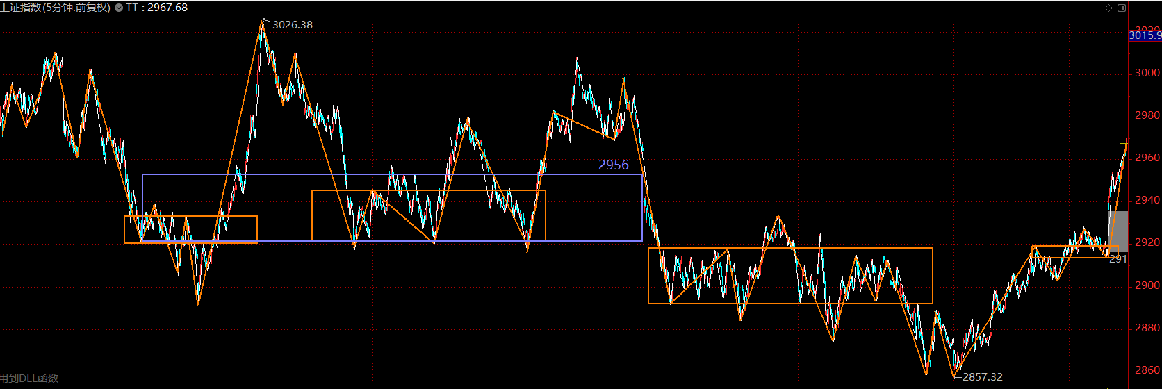 上周市場用前四天的時間,完成了這一輪五分鐘上漲趨勢的第一個中樞構建,是一個奔走型的中樞,隨后在周五開始了主升階段。值得欣喜的是,市場終于在2956這個大關口放量了,并且一舉突破,預計在2956到3000點這40點的空間內,市場將會完成五分鐘上漲第二個中樞的構建,并且橫盤將其擴展為30分鐘級別,時間周期大約是極點出現(xiàn)后的10到15個交易日。這將是投資者積極調倉換股,耐心布局年報行情的最佳時期。