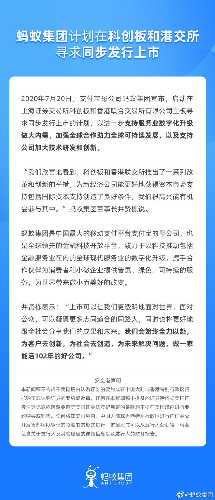 7月20日下午,支付寶母公司螞蟻集團(tuán)在官方微博宣布,該集團(tuán)計(jì)劃在科創(chuàng)板和港交所尋求同步發(fā)行上市。