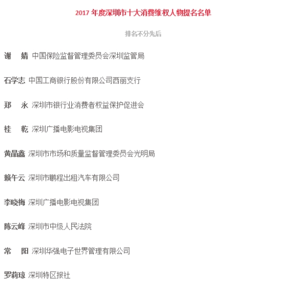 現(xiàn)經(jīng)人物推薦、專家初審、網(wǎng)絡(luò)投票審議通過,文寶飛等10名同志為“2017年度深圳市十大最美消費維權(quán)人物”,謝婧等10名同志為“2017年度深圳市十大最美消費維權(quán)人物” 提名。