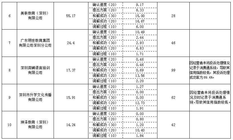 在本次公布的教育培訓(xùn)行業(yè)消費維權(quán)信用指數(shù)排名中,深圳市明德盛世教育科技有限公司的消費維權(quán)信用指數(shù)為76.25,排名第一,其2017年4月1日至2018年3月31日期間的投訴量為31宗;坤澤教育(深圳)有限公司的消費維權(quán)信用指數(shù)為14.24,排名第十,其2017年4月1日至2018年3月31日期間的投訴量為42宗。