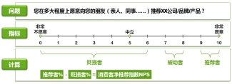 請用戶回答“您在多大程度上愿意向您的朋友(親人、同事……)推薦XX公司/產(chǎn)品?”根據(jù)用戶的推薦意愿,將用戶分為三類:推薦者(得分在9-10之間)、被動者(得分在7-8之間)、貶損者(得分在0-6之間)。