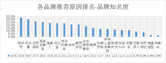 品牌知名度推薦率排名:排名前三的是思妍麗、歐潔蔓、克麗緹娜;