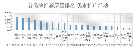優(yōu)惠推廣活動推薦率排名:排名前三的是科麗研肌、悅己堂、雅望造型。
