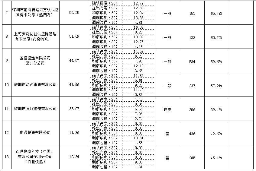 據(jù)市消委會(huì)數(shù)據(jù)顯示,深圳市快遞物流行業(yè)消費(fèi)維權(quán)信用指數(shù)排名前三的企業(yè)分別是:中國郵政速遞物流股份有限公司深圳分公司,消費(fèi)維權(quán)信用指數(shù)89.17,信用等級(jí)優(yōu)秀;深圳海帶寶網(wǎng)絡(luò)科技有限公司,消費(fèi)維權(quán)信用指數(shù)80.10,信用等級(jí)優(yōu)秀;順豐速運(yùn)有限公司,消費(fèi)維權(quán)信用指數(shù)72.55,信用等級(jí)良好。本次排名靠后的企業(yè)是:深圳市德邦物流有限公司,消費(fèi)維權(quán)信用指數(shù)33.07,信用等級(jí)較差;申通快遞有限公司,消費(fèi)維權(quán)信用指數(shù)11.86,信用等級(jí)差;百世物流科技(中國)有限公司深圳分公司,消費(fèi)維權(quán)信用指數(shù)10.34,信用等級(jí)差,排名最后。