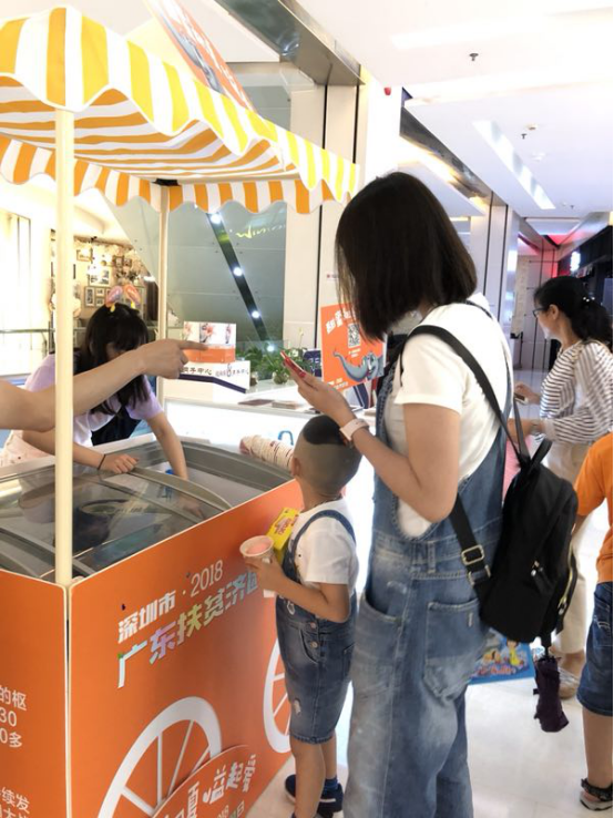 6月23日,“甜蜜初夏 慈善一直在”深圳10大地標冰激凌義賣活動在在福田星河COCO Park啟動。現場,很多逛商場的市民掃碼購買冰淇淋,為扶貧濟困活動捐款。特別讓志愿者感觸的是,不少家長帶著小朋友路過,看到是給貧困人們貢獻愛心,紛紛參與進來要買冰激凌。