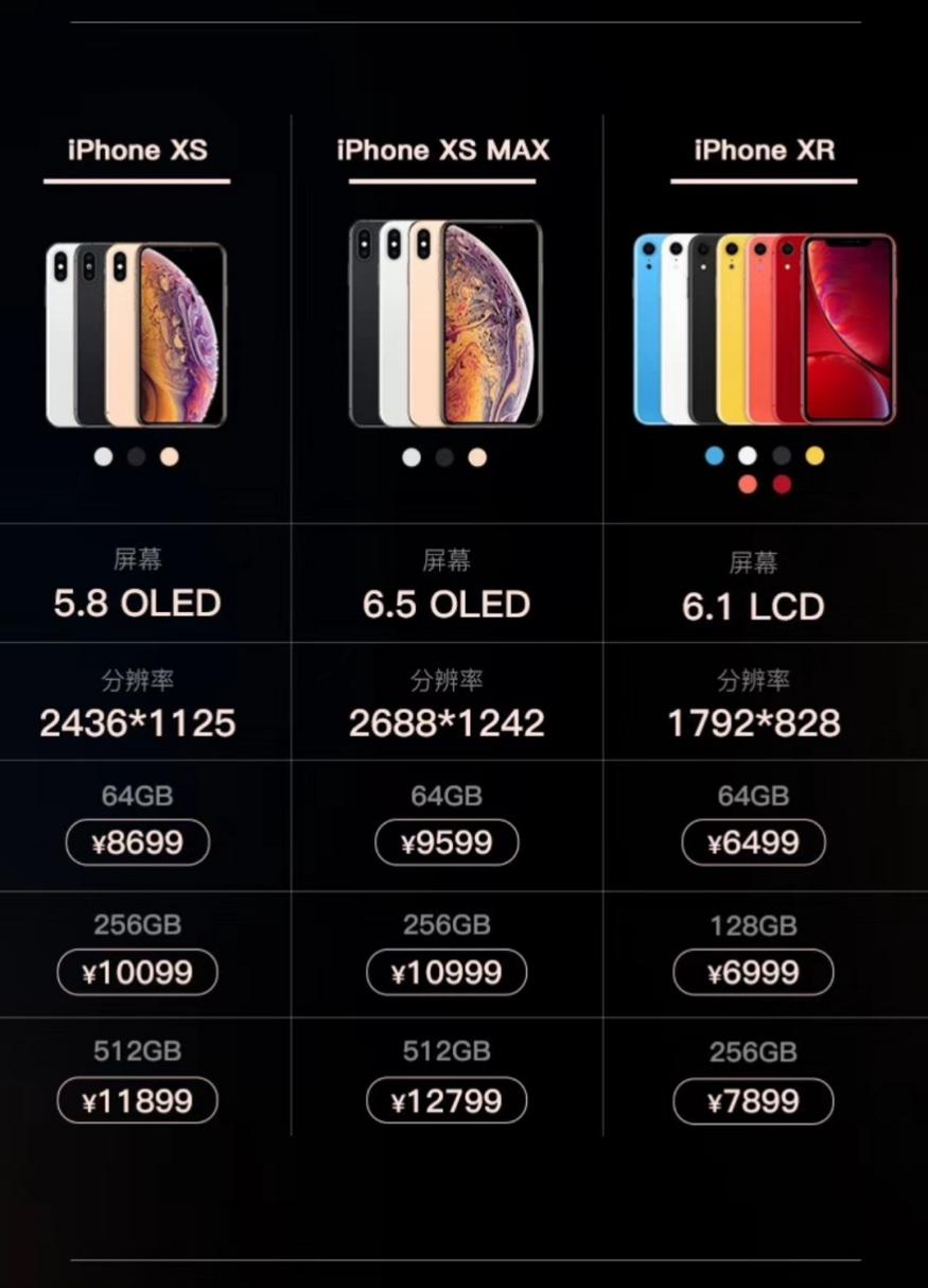 這次的三款新機(jī)都以“iPhone X”為命名基礎(chǔ),可以看做是X的半代升級版本,分別叫做iPhoneXR、iPhoneXS、iPhoneXS Max,三者主要區(qū)別在屏幕大小上:5.8英寸、6.1英寸和6.5英寸。