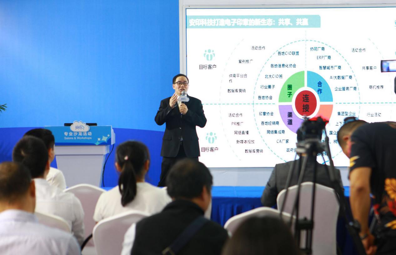 隨后,安印科技營(yíng)銷副總劉昕發(fā)表了演講,他給大家分享了安印對(duì)電子簽章技術(shù)應(yīng)用前景的思考和探索,并對(duì)安印電子印章生態(tài)圈進(jìn)行全方位的解讀。劉總表示,對(duì)于企業(yè)來說進(jìn)入數(shù)字時(shí)代的深遠(yuǎn)影響與沖擊,絕不僅僅是技術(shù)上的創(chuàng)新與突破,更將是一次理念認(rèn)識(shí)的徹底洗禮。通過由傳統(tǒng)蓋章模式向互聯(lián)網(wǎng)簽章模式的轉(zhuǎn)變,安印電子印章生態(tài)圈能有效地助力企業(yè)運(yùn)營(yíng)的提質(zhì)、增效、降本,不斷迸發(fā)出改變與前進(jìn)的力量。