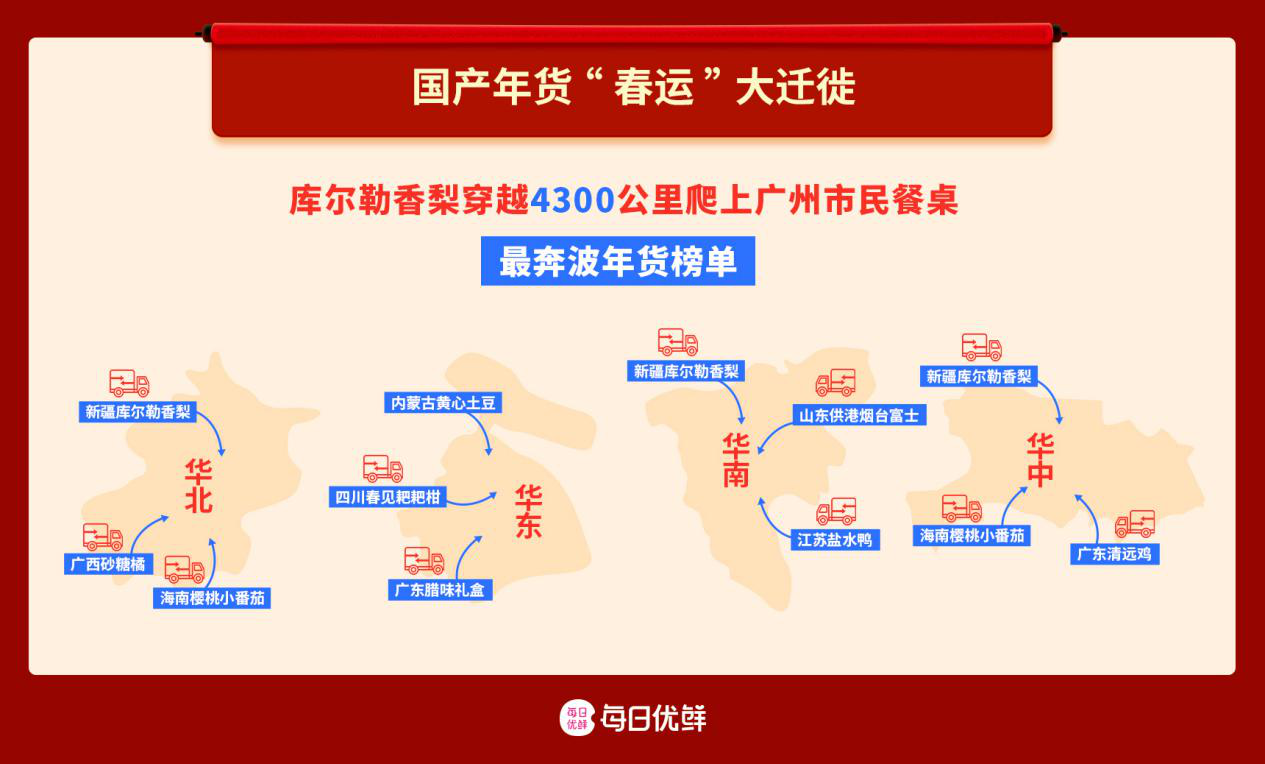 在“最奔波年貨榜單”里,每日優(yōu)鮮為各地的年貨特產(chǎn)都計(jì)算了“春運(yùn)”路程?;浭脚D味禮盒和廣東清遠(yuǎn)雞就分別成了華東和華南最有人氣的特色年貨之一。