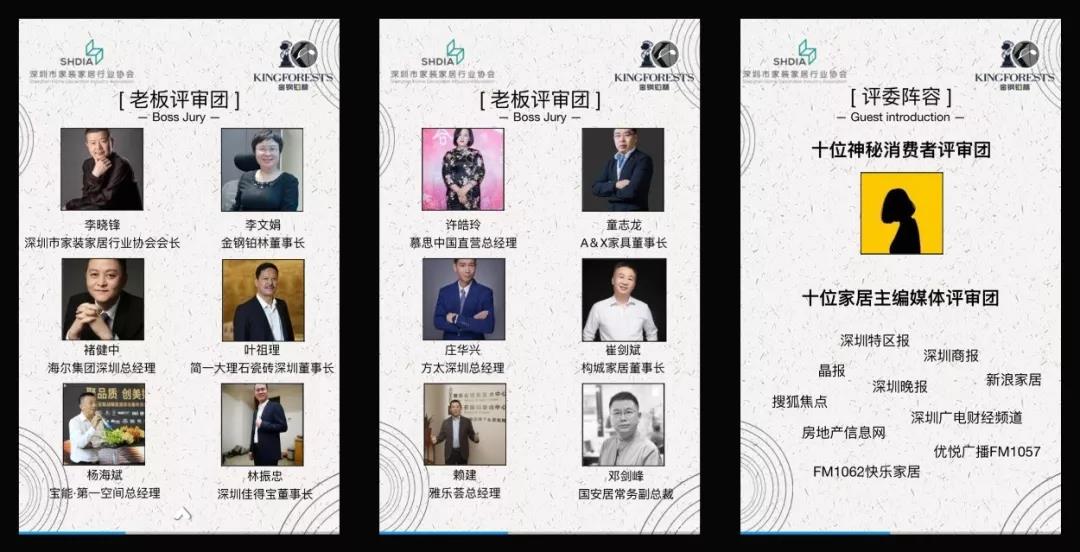 其中,由簡(jiǎn)一大理石瓷磚、海爾卡薩帝、慕思寢具、A&X家具、方太電器、構(gòu)城定制、雅樂薈、寶能第一空間、國(guó)安居、佳得寶等家居行業(yè)知名品牌老總組成的老板評(píng)審團(tuán)特別引人注目。組委會(huì)特別介紹,這些品牌在行業(yè)的影響力有目共睹,他們的認(rèn)可是對(duì)設(shè)計(jì)能力與市場(chǎng)影響力不可置疑的肯定。
