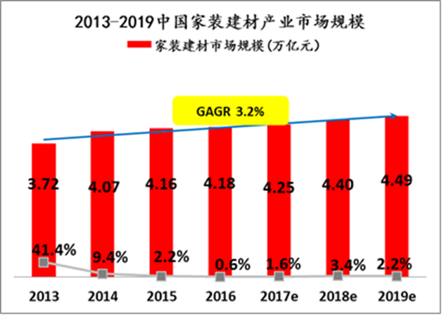 億歐智庫(kù)數(shù)據(jù)顯示,目前家裝市場(chǎng)復(fù)合年增長(zhǎng)率維持在3.2%,2019年家裝市場(chǎng)銷(xiāo)售規(guī)模接近4.5萬(wàn)億,但家裝建材互聯(lián)網(wǎng)滲透率小于10%,經(jīng)營(yíng)模式以傳統(tǒng)的區(qū)域性“散打”為主,無(wú)法滿(mǎn)足90后主體消費(fèi)者互聯(lián)網(wǎng)化、社交化、全國(guó)性購(gòu)買(mǎi)的需求,家裝行業(yè)大整合的呼聲越來(lái)越高。