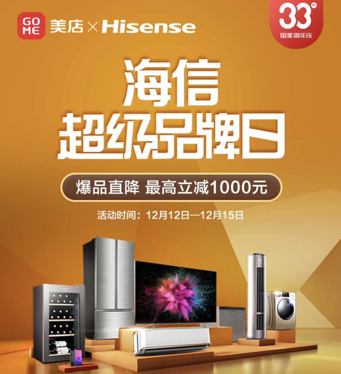 12月12日-15日,33周年生日之際,國美與海爾再度攜手,國美美店帶來海爾超級品牌日活動,涵蓋了海爾冰箱、洗衣機(jī)、空調(diào)、電視、廚房衛(wèi)浴等多個品類豐富產(chǎn)品,多重優(yōu)惠福利、六大承諾保障、延保清洗服務(wù)。