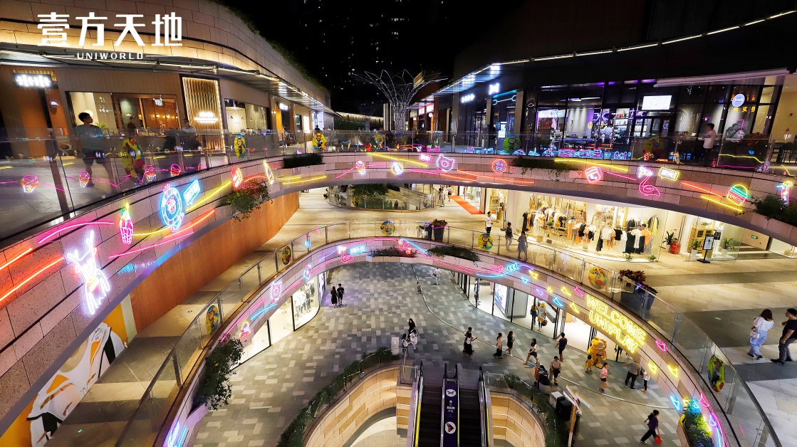 “顏值是第一生產(chǎn)力”,要打造夜間標(biāo)桿,氛圍營(yíng)造必不可少。壹方天地將燈飾與建筑、綠植等多個(gè)元素巧妙結(jié)合,璀璨的景觀燈、夢(mèng)幻的星星燈、妙趣橫生的IP主題霓虹燈烘托出獨(dú)具一格的藝術(shù)氛圍。夜晚時(shí)分搭配噴泉秀和噴霧,光影夢(mèng)幻,玉壺光轉(zhuǎn),營(yíng)造出極富層次感的夜景。同時(shí),通過(guò)加強(qiáng)外圍的燈光照明等,持續(xù)亮化夜間氛圍,壹方天地成為夜間休閑、聚會(huì)的絕佳場(chǎng)所?!跋M(fèi)者沒事也喜歡來(lái)走一走,享受工作之余的休閑時(shí)光?!迸藸N峰說(shuō)道。