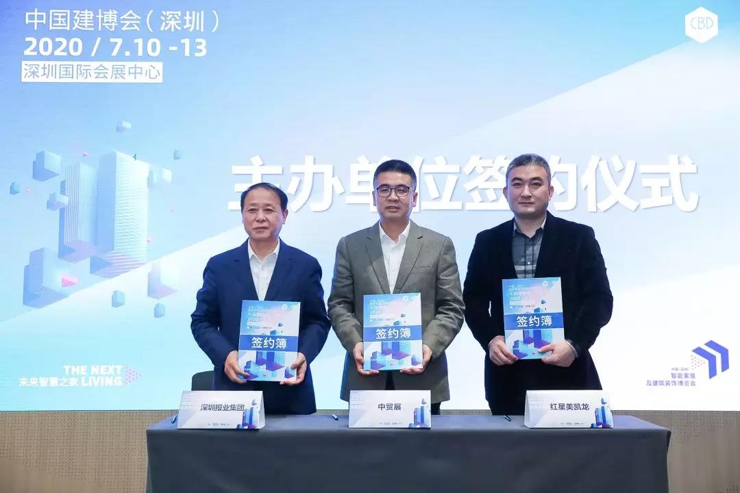 致辭結(jié)束后,中國建博會(深圳)三家主辦單位中貿(mào)展、紅星美凱龍、深圳報業(yè)集團現(xiàn)場進行簽約儀式。