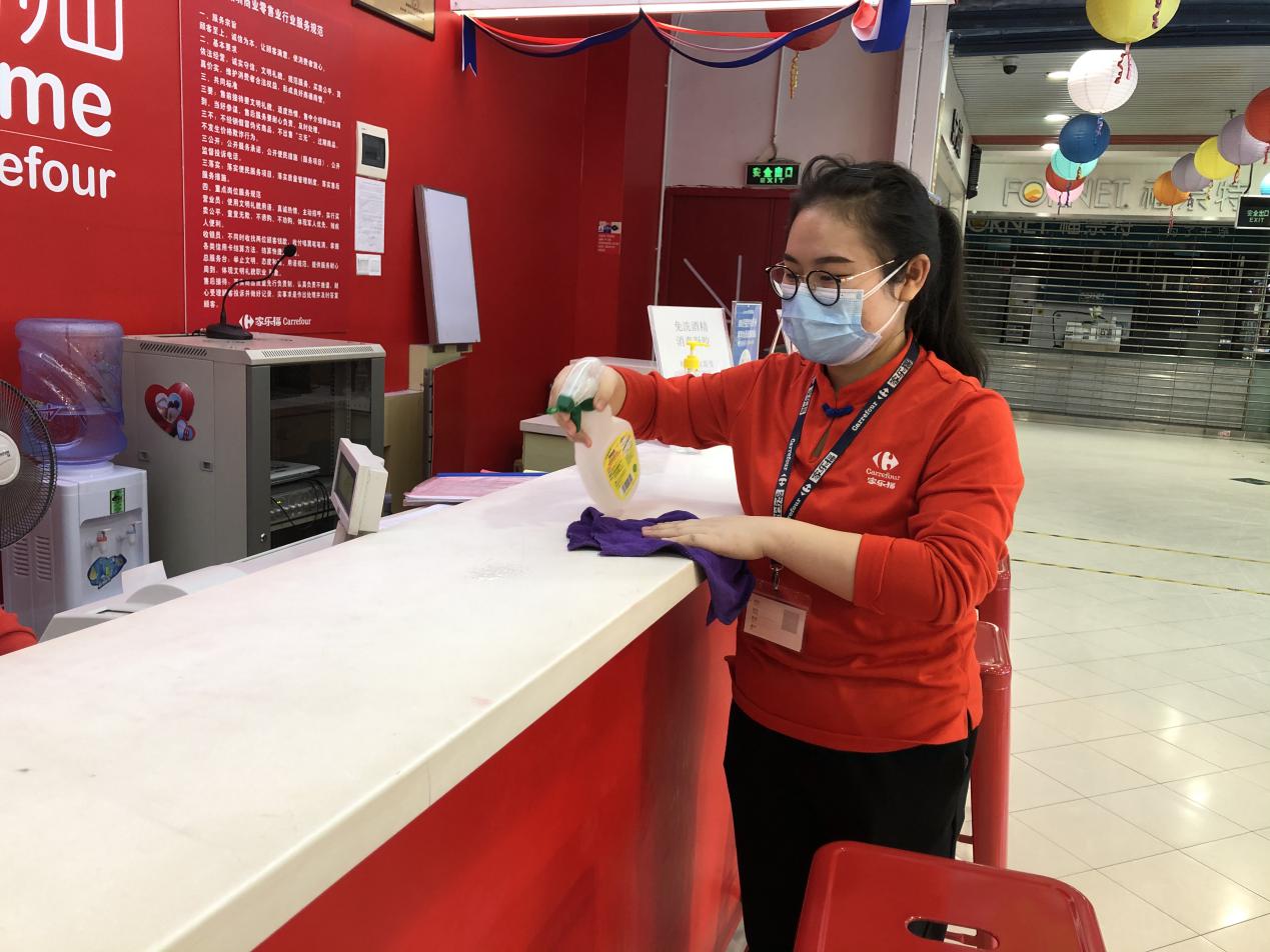 陳翠姣這次被分配到了超市收銀部門,由于是標(biāo)準(zhǔn)化操作,加上使用移動支付的顧客較多,技術(shù)難度不大,在資深員工的耐心指導(dǎo)下,她上手很快。陳翠姣表示對新崗位很滿意,她說,賦閑在家太久了,這次能換崗上任,很開心,“尤其是能夠加入到保障城市民生供應(yīng)的大型商超,非常有意義。”下午3點(diǎn),陳翠姣為服務(wù)中心柜臺做第三次消毒清潔后,便可以結(jié)束今日的早班工作,打卡下班了。