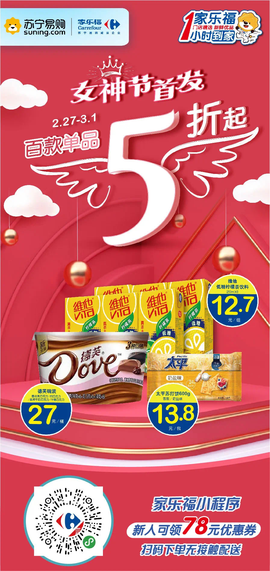 此外,還有上百款5折好物,即刻搶起來(lái)!德芙巧克力27元/桶、維他低糖檸檬茶12.7元/組,太平蘇打餅600g裝13.8元/包。家樂(lè)福小程序無(wú)接觸配送,宅家輕松購(gòu)!