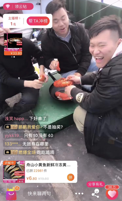 一旁直播的尹鴻狀態(tài)正好,從剛開(kāi)播到現(xiàn)在,直播間的人數(shù)嗖嗖往上竄,不一會(huì)便聚集了十幾萬(wàn)圍觀群眾。搖晃的直播鏡頭,更具真實(shí)感,似乎把觀眾帶到了船上一般。尹鴻馬不停蹄在船上踱步,給觀眾介紹各種海鮮小知識(shí),并大力吆喝起這次直播主打的兩款產(chǎn)品:深海小黃魚(yú)和舟山帶魚(yú)。“我們蘇寧拼購(gòu)的海產(chǎn)品都是從張老大這樣漁民手中收來(lái)的,下單直發(fā),眼見(jiàn)為實(shí)?!?/p>