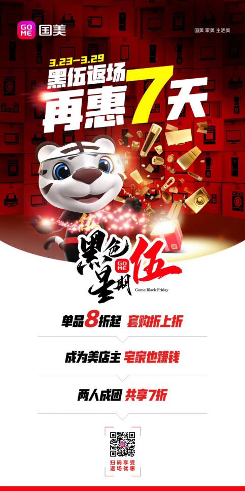 據(jù)了解,3月23日-3月29日,國美零售“黑伍”返場,再惠7天。在此期間,國美多種優(yōu)惠玩法悉數(shù)上線。用戶將不僅享受單品8折起、套購折上折的優(yōu)惠,成為美店主,還能宅家賺錢,享受商品返利。此外,還有兩人成團(tuán),共享7折等,快來國美美店廚飲專場選購吧。