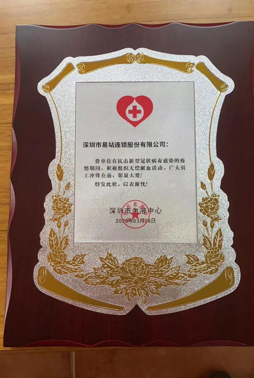 在得知站友們?nèi)绱朔e極熱情的參與獻(xiàn)血后,深圳市血液中心特地向易站連鎖頒布了感謝牌。