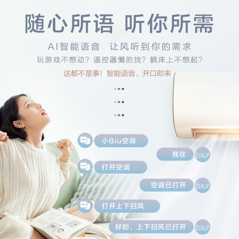 此外,小Biu空調(diào)Max搭載了AI智能語(yǔ)音控制技術(shù),你只需要對(duì)它說(shuō)“小Biu空調(diào)”將其喚醒,就能實(shí)現(xiàn)開機(jī)關(guān)機(jī)、模式切換、調(diào)節(jié)溫度等操作,實(shí)現(xiàn)了真正的智能語(yǔ)音操控。同時(shí),小Biu空調(diào)Max采用行業(yè)一流的海立壓縮機(jī),并具有高溫自清潔、APP遠(yuǎn)程控制、急速冷暖等亮點(diǎn)功能,提供整機(jī)6年、壓縮機(jī)10年保修的服務(wù)。