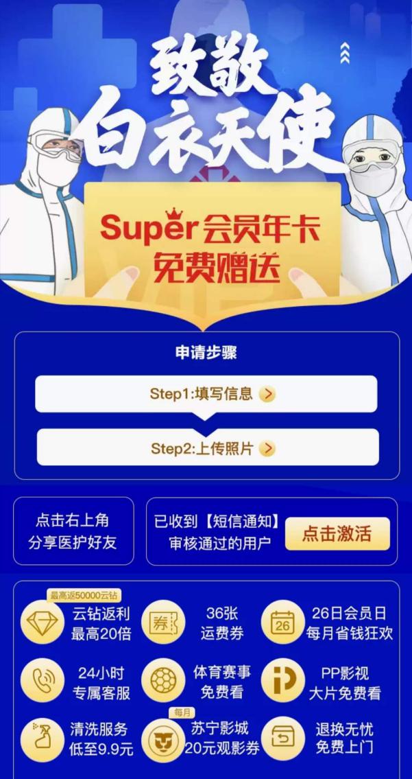 3月30日,蘇寧宣布加碼此次活動(dòng),Super會(huì)員贈(zèng)送對(duì)象不僅包括具備執(zhí)業(yè)資格證書的醫(yī)生和護(hù)士,還包括藥師和技師,藥師和技師包含不限于放射影像科技師、檢驗(yàn)科技師、口腔科技師、藥劑師、康復(fù)治療師等。消息發(fā)布后,藥師申請(qǐng)人數(shù)日均環(huán)比增長(zhǎng)達(dá)89%,技師申請(qǐng)人數(shù)日均環(huán)比增長(zhǎng)達(dá)145%。醫(yī)院行政、公共衛(wèi)生醫(yī)師、感染管理、海關(guān)衛(wèi)生檢疫人員、救護(hù)車駕駛員、心理治療師、醫(yī)院信息科工程師等人員也紛紛遞交申請(qǐng)。