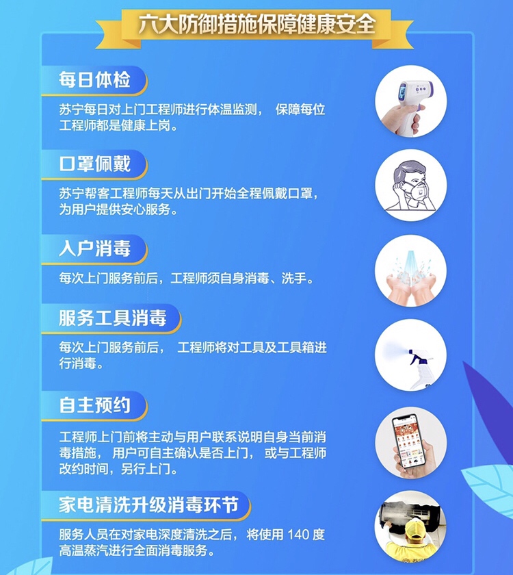據(jù)了解,該承諾卡是蘇寧創(chuàng)建,主要承諾內(nèi)容包括服務(wù)前的體溫檢測(cè)、工具消毒、個(gè)人防護(hù);服務(wù)中的工程師全防護(hù)、工具不落地、與用戶保持安全距離;服務(wù)后的機(jī)器清潔、線上保修減少上門以及清理服務(wù)現(xiàn)場(chǎng)。