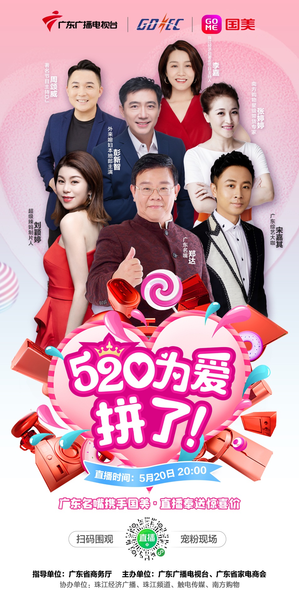 見(jiàn)圳客戶端·深圳新聞網(wǎng)2020年5月15日訊 在廣東省商務(wù)廳指導(dǎo)下,由廣東廣播電視臺(tái)、廣東省家電商會(huì)和華南國(guó)美聯(lián)合舉辦,“520為愛(ài)拼了”超級(jí)直播將于5月20日晚8點(diǎn)整驚喜開(kāi)播!廣東名嘴鄭達(dá)、綜藝大咖宋嘉其、影視演員彭新智攜一眾明星主播為廣東省的街坊們帶來(lái)空調(diào)、冰箱、洗衣機(jī)、電視、手機(jī)等大批家電潮品!屆時(shí),主播們不僅給街坊們帶來(lái)意想不到的低價(jià),直播中還會(huì)不間斷抽出手機(jī)、家電等大批豪禮,敬請(qǐng)期待!這次直播是全國(guó)首次大小屏同步直播,街坊們不僅可以通過(guò)美店商城、看點(diǎn)直播、京東、珠江頻道直播小程序、珠江經(jīng)濟(jì)廣播呼啦直播小程序、南方購(gòu)物直播小程序、觸電新聞APP等平臺(tái)在線觀看并下單,而且還可以打開(kāi)南方購(gòu)物電視頻道下單購(gòu)買。