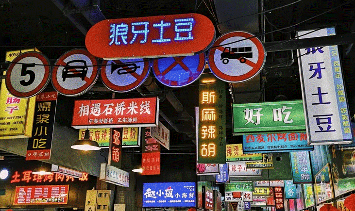 負一樓超市外yes街,統(tǒng)一的燈光亮化,霓虹夜市街景搭配美味食物,遇上“饑腸轆轆”的人群,擦出“狼吞虎咽”的火花。美食是繁榮夜市的永恒主題,品類多樣,飄香四溢,定被“吃貨”們喜愛。