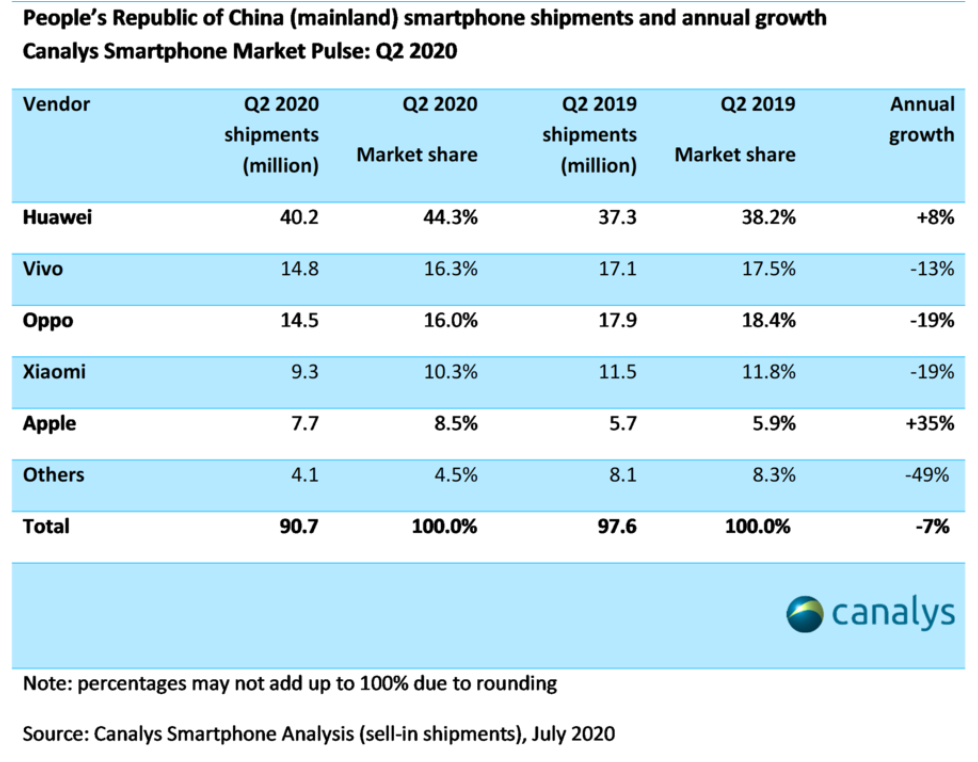 見圳客戶端·深圳新聞網(wǎng)2020年8月3日訊 知名調(diào)研公司Canalys發(fā)布的最新數(shù)據(jù)顯示,盡管與2019年第二季度相比市場萎縮了7%,但中國智能手機(jī)市場的季度環(huán)比增長了25%,在2020年第二季度達(dá)到9000多萬臺。