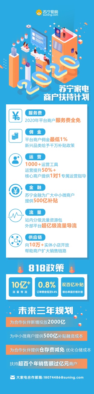 蘇寧宣布,2020年蘇寧將免收平臺商戶服務(wù)費;向中小微商戶提供500億補(bǔ)貼融資成本,幫助商戶緩解資金壓力;平臺上的商品供應(yīng)鏈會向蘇寧生態(tài)中10萬+實體小店開放,幫助商戶擴(kuò)大銷售通路。同時,大家電行業(yè)線將持續(xù)給平臺商戶匹配站內(nèi)外的億級流量,并通過星河生態(tài)賦能平臺開放1000+運營工具,針對核心商戶提供1對1專屬運營指導(dǎo),借此幫助商戶有效提升經(jīng)營效率,降低運營成本。
