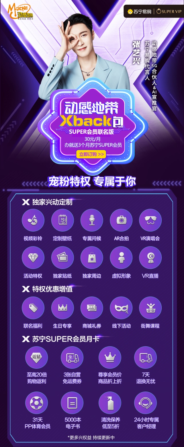618期間張藝興成為蘇寧易購代言人,7月21日中國移動(dòng)官宣張藝興為動(dòng)感地帶5G合伙人&AI宣推官。SUPER聯(lián)名版動(dòng)感地帶Xback包在818期間推出,讓蘇寧易購和中國移動(dòng)的跨界營銷合作浮出水面,外界也更好奇,818之后,蘇寧易購和中國移動(dòng)是否還會(huì)有更大的動(dòng)作。