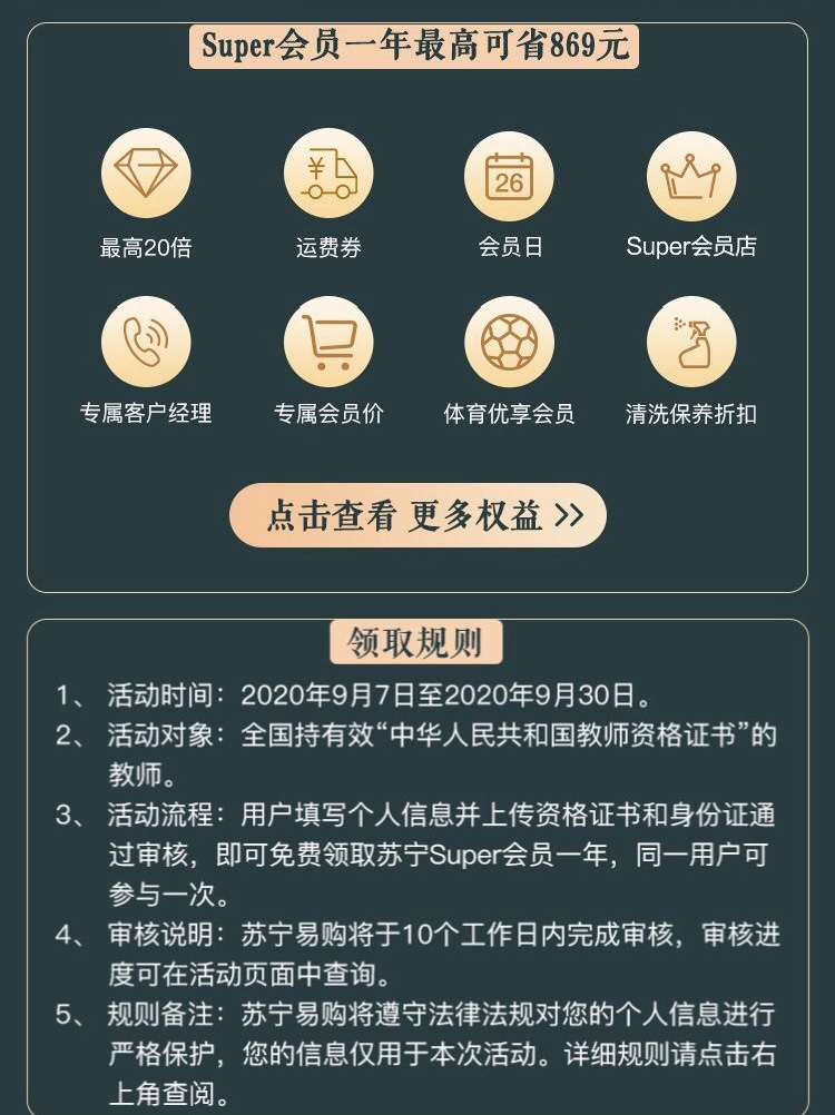 9月7至9月30日,凡持有效“中華人民共和國教師資格證書”的老師,在蘇寧易購AP P上搜索“教師”,進入 Super會員領(lǐng)取頁面,填寫個人信息并上傳資格證書和身份證。通過審核后,即可免費領(lǐng)取蘇寧Super會員年卡一張。