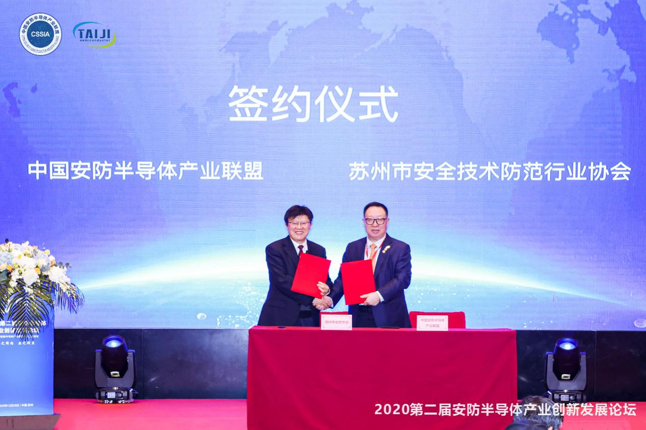 中國安防半導體產(chǎn)業(yè)聯(lián)盟主席楊金才和蘇州市安全技術防范行業(yè)協(xié)會秘書長王坤泉現(xiàn)場進行簽約