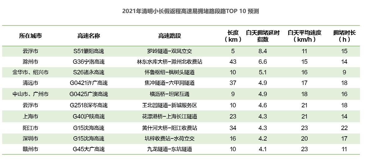 具體時段方面,預(yù)計(jì)2021年4月2日(清明小長假前一天)15時開始,全國高速交通壓力逐漸增大,20時至23時擁堵程度較高;4月3日(清明小長假第一天)8時至12時高速迎來出程擁堵高峰,預(yù)計(jì)10時至11時達(dá)峰值,4月5日(清明小長假最后一天)14時至19時為高速返程擁堵高峰。