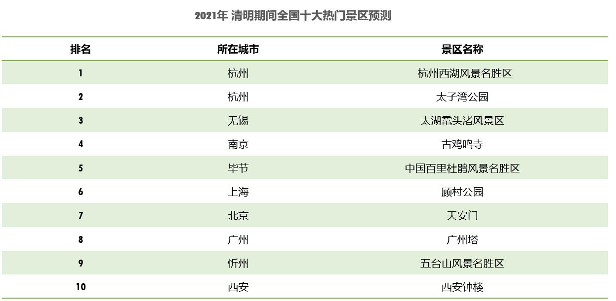 預(yù)計(jì)清明假期杭州西湖風(fēng)景名勝區(qū)最為熱門,其次為太子灣公園、太湖黿頭渚風(fēng)景區(qū)、古雞鳴寺、中國百里杜鵑風(fēng)景名勝區(qū)、顧村公園、天安門、廣州塔、五臺山風(fēng)景名勝區(qū)、西安鐘樓。