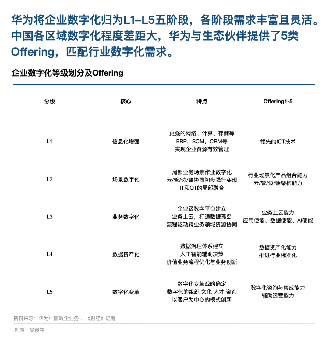 應(yīng)對(duì)每個(gè)階段的數(shù)字化挑戰(zhàn),需要提供可靈活搭配的能力,其中可能涉及ICT技術(shù)這類(lèi)L1級(jí)能力,也可能涉及數(shù)字化咨詢(xún)、集成、輔助運(yùn)營(yíng)這類(lèi)L5級(jí)能力。為此,華為攜手伙伴提供了5類(lèi)Offering。