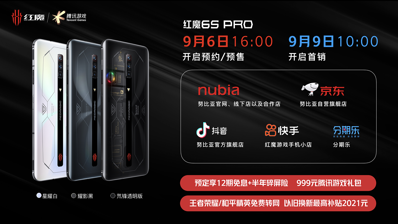 紅魔6S Pro目前已在努比亞官網(wǎng),努比亞京東自營旗艦店開啟預(yù)售,9月9日上午10點(diǎn)全國線上線下渠道同步開售!現(xiàn)在預(yù)定享12期免息并贈(zèng)送半年碎屏險(xiǎn),購機(jī)尊享價(jià)值999元的騰訊游戲禮包、王者榮耀/和平精英免費(fèi)轉(zhuǎn)網(wǎng)資格,以舊換新最高補(bǔ)貼2021元。