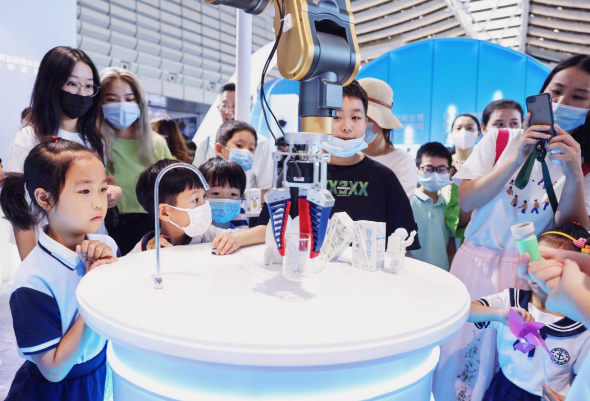 這牛奶和其他的不太一樣,很香濃?!半x心精萃‘白科技’開啟臻濃新紀元”展臺一直就是博覽會現(xiàn)場的“人氣王”,這里以宇宙探索為主題,科幻感十足,火箭發(fā)動機噴出淡淡煙霧,三臺智能機械臂不停忙碌,人們排起長隊,品嘗由“離心精萃科技”現(xiàn)場調制的伊利臻濃牛奶。在這里,吸引觀眾的不僅是美味的伊利牛奶,也有滿滿的數(shù)字科技。